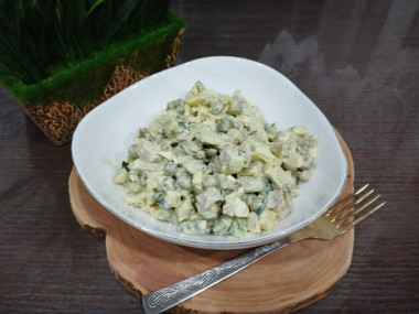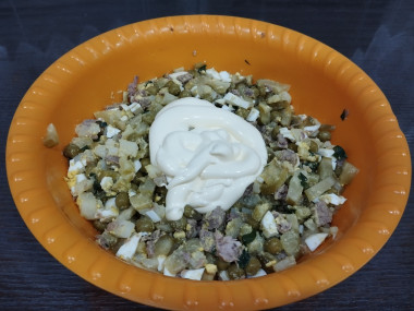 Приготовила к приезду сыночка салат с говядиной и солёным огурцом. Заранее отварила мясо, картофель,яйца и поэтому приготовление салата не заняло много времени. Все ингредиенты порезала небольшими кубиками, добавила горошек, измельчённую зелень петрушки, майонез и перемешала.