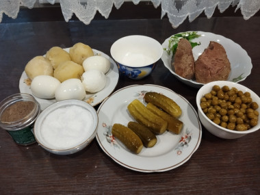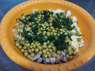 В миске соедините вареную говядину, картофель, огурцы, зеленый горошек, яйца и зелень.