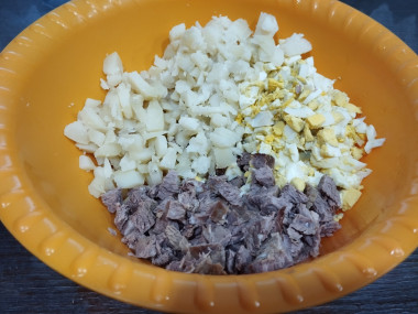 Яйца сварите вкрутую, охладите и очистите. Нарежьте такими же кубиками, как и картошку.