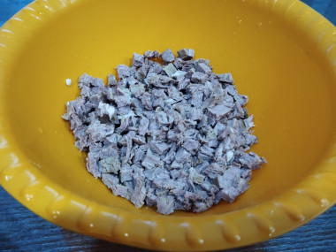 Картофель отварите в кожуре до готовности, охладите и очистите. Нарежьте небольшими кубиками.
