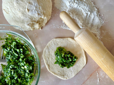 Готовое тесто раскатайте на небольшие кружки, в центр кружка положите немного зеленой начинки, в середину насыпьте чуть больше половины ч. л. сахарного песка. Залепите, как обычные пирожки.