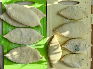Сахар решила добавить сразу к щавелю и перемешала. Сахара добавила немного больше, где-то на 20 г, так как хотелось начинку послаще. Я старалась делать тесто тоньше, а начинки класть больше, поэтому из указанного количества ингредиентов вышло шесть крупных пирожков с щавелем, и осталось не ного теста. Из остальной части теста я сделала пять пирожков с яблочным повидлом. Тесто нейтральное по вкусу подойдёт как под сладкую, так и солёную начинку.