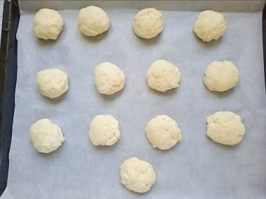 Разделите тесто на 12-14 одинаковых частей. Из каждой части сформуйте небольшие круглые заготовки размером с грецкий орех или чуть крупнее.