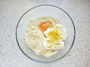 Пересыпьте получившуюся песочную крошку в миску. Добавьте яйцо, творожный сыр и лимонную цедру. В зависимости от качества муки её может понадобиться чуть больше или чуть меньше. О муке и её свойствах подробнее можно прочитать в отдельной статье, ссылка в конце рецепта.