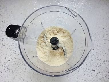 Сначала я сделала крошку из сухих ингридиентов, при этом сахара взяла на 30 г. меньше по своему вкусу. Смешивать удобно при помощи блендера. А раньше я терла масло на терке или рубила ножом вместе с мукой.