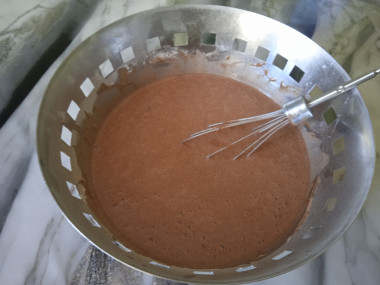 Просейте к яичной массе муку, какао и разрыхлитель. Важно просеять муку, чтобы насытить ее кислородом. Тогда выпечка получится воздушной и хорошо поднимется при выпекании.