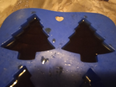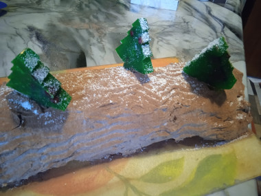 В декоре отступила от рецепта автора: мне нужно было разделить торт на три части, чтоб угостить внуков, отнести любимой тетушке и чуть-чуть отставить себе, поэтому я решила украсить полено тремя елочками (по числу угощаемых, чтоб у всех было по елке!). Для приготовления елочек взяла 150 мл зеленой газировки "Тархун", добавила чайную ложку анар-агара, прокипятила полученную смесь три минуты, затем залила в силиконовые формочки. Через полчаса мармеладные елочки были готовы!