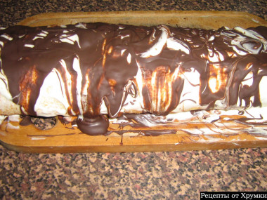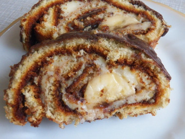 Вера, вчера, так боясь приготовила рулет, помазала его заварным кремом,положила банан и клубничный конфитюр. Нашим понравилось, но все равно я с ним повозилась, он так крошился, но моя взяла, я его все-таки завернула и получилось вот что