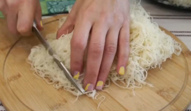 Тесто катаифи разрежьте на небольшие кусочки.