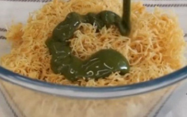 Добавьте тесто катаифи и перемешивайте. Готовьте на среднем огне до тех пор, пока тесто не приобретёт легкий золотистый цвет. Затем переложите тесто в глубокую чашу (тесто должно остыть). О том, как выбрать идеальную сковородку читайте в статье под данным рецептом.