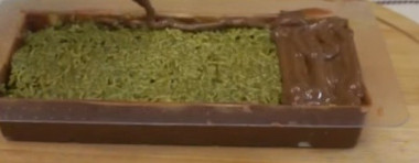 Плотным слоем выложите фисташковую начинку в подготовленный шоколадный корпус.