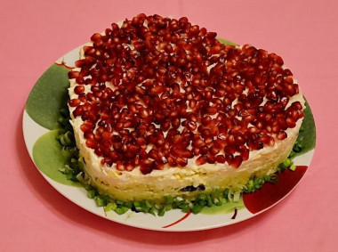 Придайте салату нужную нам форму, сверху аккуратно смажьте слоем майонеза. Обсыпьте зёрнами граната. Украсьте по своему вкусу. Всё, салатик готов! Можно охладить его перед подачей, так он будет вкусней.