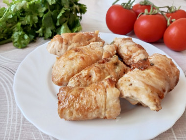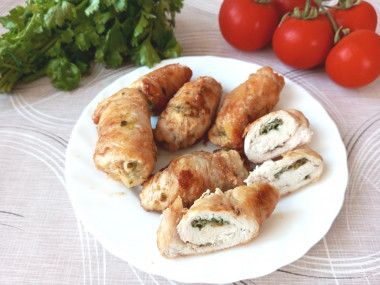 Рулетики из куриной грудки с начинкой сразу подавайте к столу в качестве закуски или второго блюда к любому гарниру. Приятного аппетита!