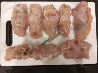 Сверните мясо рулетиками и при необходимости зафиксируйте их шпажками.