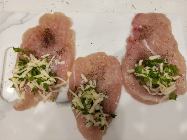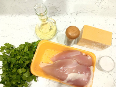Как сделать куриные рулетики с сыром и зеленью на сковороде? Подготовьте необходимые ингредиенты. Удобнее использовать готовое порционное филе без кожи. Если же у вас целая грудка на кости, то нужно отделить от нее филе и удалить кожу.