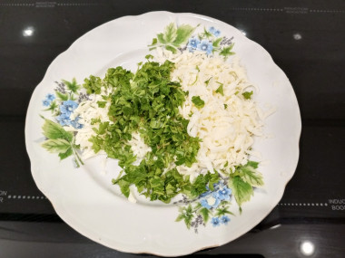 В миске соедините тертый сыр, зелень и чеснок и перемешайте.