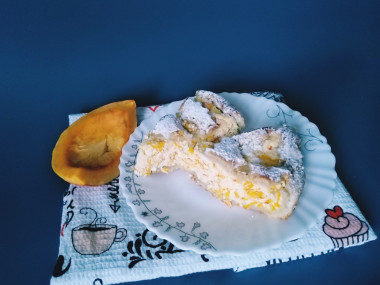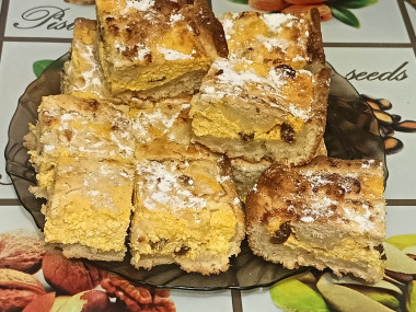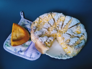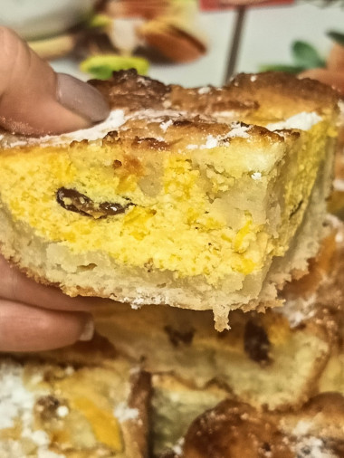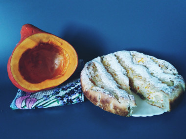 Пирог испекся быстро, за 20 минут. Тесто получилось хрустящее, а начинка влажная, при этом в некоторых местах она отслаивалась от теста и разваливалась при нарезании пирога. Я думаю, что тыква дала лишнюю влажность. И, как по мне, не хватало какого - то загустителя для творога - манки, муки или крахмала. Если добавить 1 столовую ложку манки, начинка будет более стабильно держаться на тесте. Песочное тесто я замесила не сильно густое, потому после выпечки оно немного крошилось. Это мой минус, на будущее учту. Изюм я не добавляла, просто потому, что не было в наличии, а пирога с тыквой очень хотелось. В итоге поняла, что начинка просто сладкая и чего-то не хватает, именно кислинки, которую как раз придаёт изюм. Так что, изюм здесь к месту. Вкус тыквы ощущается совсем немного,, скорее, улавливаешь её аромат. Тыква хорошо пропеклась, особо её и не чувствуешь, зато цвет у начинки насыщенно - оранжевый. Хочу отметить насчёт сладости - по ощущениям, сахар в тесте и сахар в начинке отличается в неравномерности пропорций. Начинка получилась переслащенной, скорее всего, , из-за тыквы. Я думаю, нужно добавлять одинаковое количество сахара, что в тесто, что в начинку, тогда не будет видно разницы.