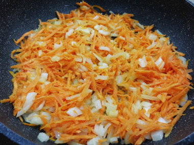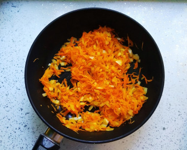 Пока варится свинина, подготовьте зажарку. В сковороде на среднем огне разогрейте растительное масло. Выложите лук и обжарьте 2-3 минуты до прозрачности. Добавьте морковь, томатную пасту и специи. Жарьте, помешивая, еще 3-5 минут.