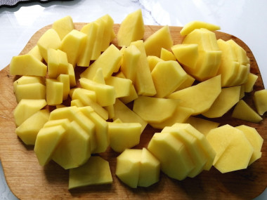 Картофель вымойте в проточной воде с щеточкой, очистите, ополосните и нарежьте средними кубиками.