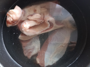 В кастрюлю выложите промытую говядину, влейте воду. На сильном огне доведите до кипения и проварите 5 минут. Воду слейте. Мясо тщательно промойте.