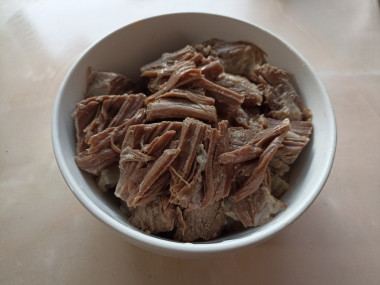 Мясо выньте из бульона, отделите от костей и нарежьте брусочками.