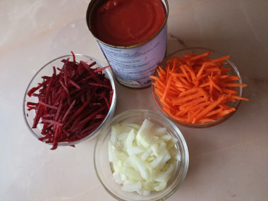 Морковь и свеклу очистите и натрите на крупной терке. Я люблю натирать овощи на терке для корейской моркови. Лук нарежьте небольшими кубиками.