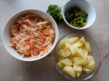 Тем временем подготовьте остальные овощи. Картофель очистите и нарежьте средними кубиками. Болгарский перец очистите от семян и нарежьте небольшими кубиками.