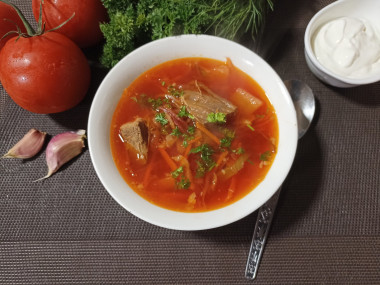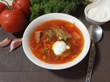 К обеду приготовила борщ с кислой капустой и свеклой с говядиной. Для экономии времени говяжий бульон сварила в мультиварке, затем процедила его в кастрюлю и далее всё готовила по рецепту автора. Получился наваристый, яркий, очень вкусный борщ. Добавление растертого с салом чеснока придает блюду аппетитный , стойкий аромат. Со сметаной и свежей зеленью - не просто борщ- сплошное наслаждение! Спасибо за рецепт, Мария!