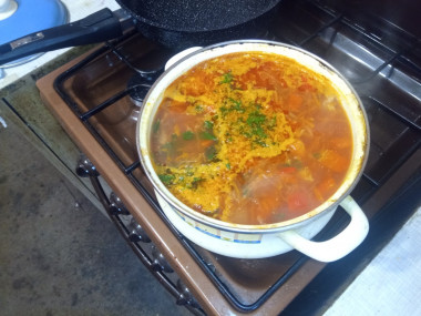 В кастрюлю выложите зажарку и квашеную капусту. Варите все вместе около 15 минут. В процессе борщ посолите, поперчите.