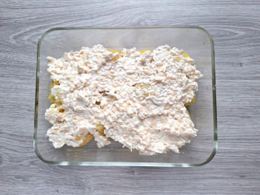 Возьмите подходящую форму для запекания. У меня керамическая, 23*16см. Смажьте ее ложкой растительного масла без запаха. Выложите в нее половинки картофеля. Я часть половинок разрезала и заполнила ими промежутки. Смажьте картошку сырной массой. О том, как выбрать форму для запекания, читайте в отдельной статье по ссылке в конце рецепта.