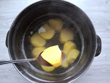 Картошку почистила, разрезала пополам и отварила в подсоленной воде. Я варила примерно 15 минут, но время зависит от сорта картошки и величины клубней. Можно просто нарезать картошку крупными кусочками или дольками, но варить при этом меньшее время. Кстати при варке картошки можно добавить в воду лавровый лист, луковицу или веточку зелени для аромата.