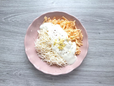 Для "шубы" натерла плавленный сырок на средней тёрке, а твёрдый сыр на крупной. У меня не было сметаны, поэтому взяла натуральный йогурт. Добавила свежий чеснок и немного специй.