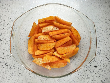 Чистые клубни картофеля вымойте, обсушите и разрежьте вдоль на 6-8 долек, положите в миску.