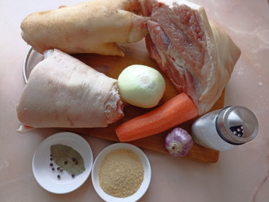 Свиные ножки/рулька: Можно добавить говяжьи ножки, хвост или уши для более насыщенного вкуса и желирующей способности.