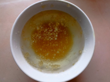 Желатин залейте холодной кипяченой водой и оставьте на 40-50 минут для набухания. Или следуйте инструкции на упаковке к своему виду желатина. Рассчитывайте желатин по 20 грамм на один литр жидкости, дополнительно о всех тонкостях работы с желатином читайте в статье под шагами.
