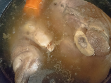 Варите без крышки примерно 4-5 часов, убирая пену. За 30 минут до окончания посолите, положите морковь, неочищенную, вымытую луковицу. Это придаст бульону красивый золотистый цвет. Снимите кастрюлю с огня, выньте ножки, мясо и рульку. А как правильно выбрать кастрюлю для приготовления можно узнать в статье под шагами.