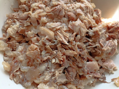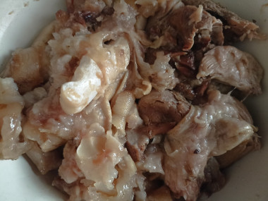 Ножки и рульку разберите, оставляя только те части, которые пойдут в холодец. Мясо порежьте мелко. Чеснок почистите, измельчите и положите в бульон. Все перемешайте и дайте постоять 5 минут.