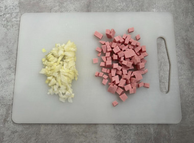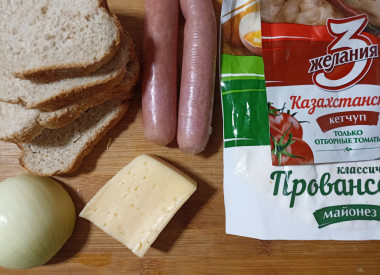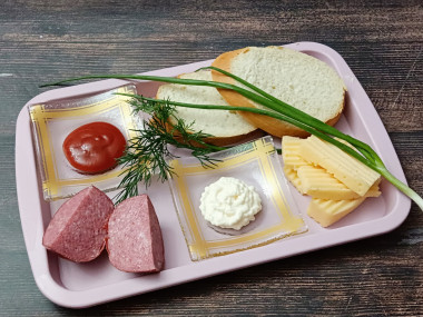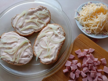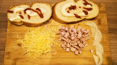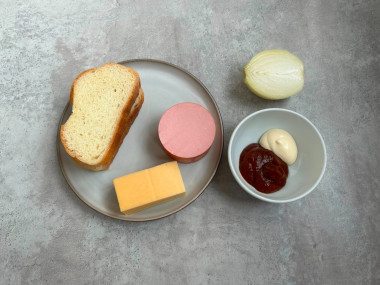 Как сделать горячие бутерброды в микроволновке с колбасой сыром луком? Подготовьте все необходимые ингредиенты.