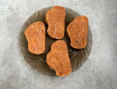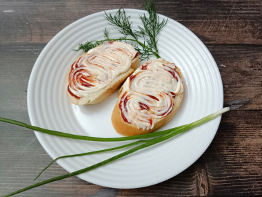 2. Смешайте кетчуп с майонезом. Тонким слоем намажьте получившимся соусом каждый ломтик батона.
