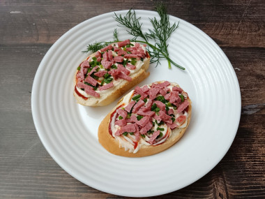 3. Репчатый лук мелко нарежьте и разложите по ломтикам батона. Можно слегка обжарить лук на растительном масле, чтобы он стал мягким. Но я люблю, чтобы лук слегка хрустел, поэтому добавляю сырой.