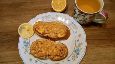 Рецепт просто находка, когда нужно быстро и сытно перекусить, а на основательный приём пищи времени совсем нет. Все продукты простые, доступные. Сыр брала пармезан, лук тоненько нарезала его полукольцами. В микроволновке держала ровно 1 минуту. Под грилем не держала. Этого вполне хватило, чтобы аппетитно расплавился пармезан. Чай у меня был заварен имбирно-лимонный с мелиссой и шалфеем. Перекус получился просто отменный, быстрый, вкусный, сытный. Отличный рецепт, рекомендую, готовьте с удовольствием, наслаждайтесь!