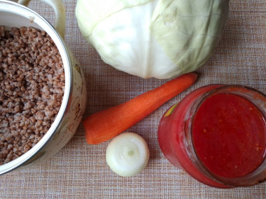 Как сделать голубцы с гречкой? Подготовьте необходимые ингредиенты. Кочан капусты у меня был небольшой, весом 1 кг. Его хватило только на половину всего количества получившейся начинки. Так что лучше брать кочан побольше. Воды может понадобиться больше или меньше в зависимости от количества получившихся голубцов и размеров кастрюли.