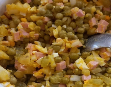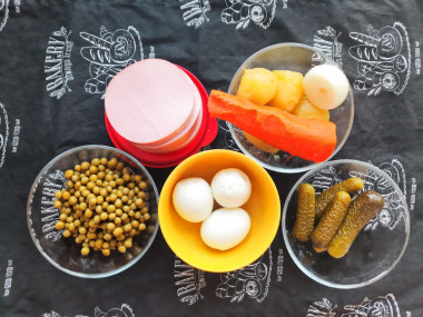 Советский салат Оливье на моём столе уже давно не только новогодний/праздничный салат. Готовлю довольно часто. Предварительно отварить нужно только морковь с картошкой и яйца. Картофель, морковь, лук, яйца, солёные огурцы и варёную колбасу нарезаю мелким кубиком. Смешиваю все ингредиенты в одной миске, плюс добавляю консервированный горошек. Перемешиваем и можно раскладывать по тарелкам. У нас каждый сам в своей тарелке заправляет свой салат. Преимущественно майонезом.