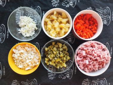 Морковь отварить, снять кожицу и нарезать кубиком. Старайтесь, чтобы все ингредиенты были нарезаны одинаковым размером