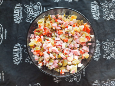 Для лучших вкусовых качеств, старайтесь нарезать весь салат одинаковым, некрупным кубиком, как говорится: -"Салат Оливье", должен помещаться на одной ложке! Т.е все его ингредиенты должны употребляться одновременно, каждый кубик.