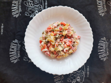 Этот старинный салат оливье — истинное произведение кулинарного искусства. Его вкус поражает своей нежностью, гармонией и насыщенностью. Ингредиенты идеально сочетаются, создавая уникальный ансамбль. Приятно, что салат приготовлен по классическому рецепту, который сохраняет традиции и позволяет ощутить вкус прошлого. Это великолепное блюдо станет украшением любого стола. Не зря говорят, что новое — это хорошо забытое старое. Этот рецепт остается популярным во все времена.