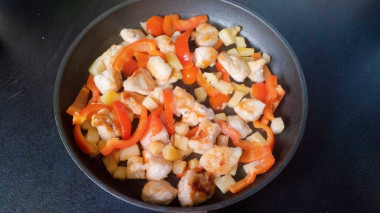 Добавьте в сковороду ананасы, сладкий перец, ананасовый сок, томатную пасту, соевый соус и уксус. Все перемешайте и тушите на медленном огне около 10 минут. Если в процессе соус сильно выпаривается и масса получается слишком вязкая, можно влить еще воды или ананасового сока. Количество жидкости регулируйте на свой вкус.