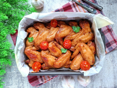 Переложите крылья в застеленную пергаментом форму для запекания в один слой. Поставьте форму в разогретую до 200℃ духовку и запекайте крылышки около 30 минут до золотистой корочки, периодически смазывая ранее отложенным маринадом. Подробнее о том как правильно подобрать форму для запекания, время и температуру духовки читайте в статьях. Ссылки находятся в конце рецепта.