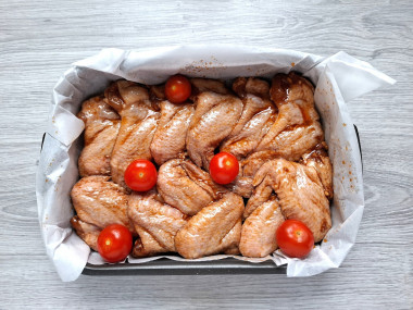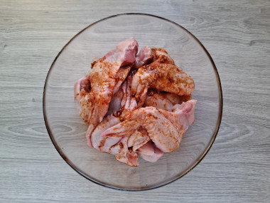 Выложите в миску с маринадом подготовленные крылья и тщательно перемешайте.