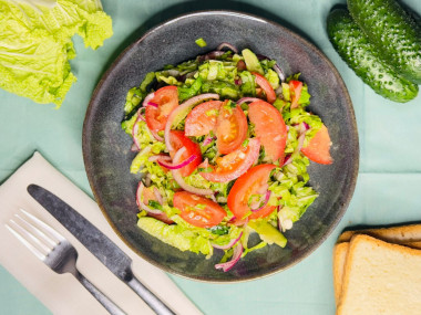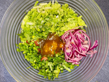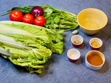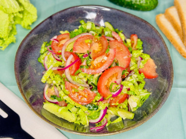 Листья салата заменила зелёными листьями от китайской капусты. Как предложил автор укроп можно заменить на другую зелень. Я использовала зелёный лук, репчатый лук заменила на красный салатный. У меня было всего три помидора поэтому вместо четвёртого взяла обычный огурец и один крупный зубчик чеснока.